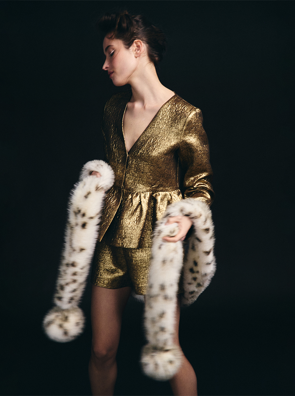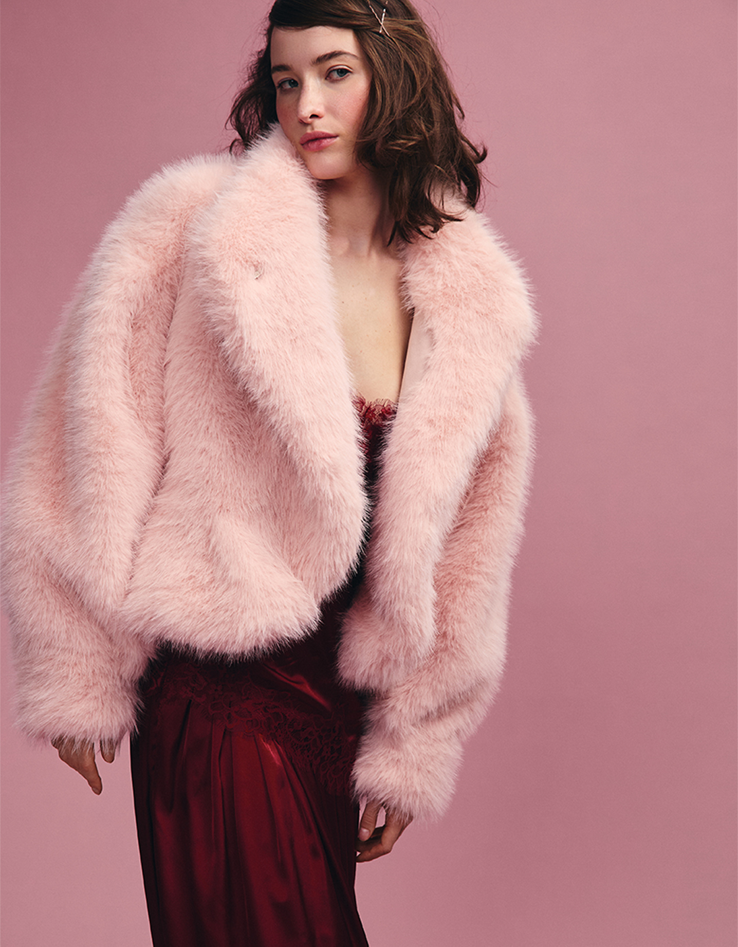 В центре внимания — эффектная укороченная шуба с объёмными рукавами и притачной баской. Модель выпущена лимитированным тиражом в трёх вариациях экомеха под песца — нежно-розовом, светлый леопард и вишня. Подробнее